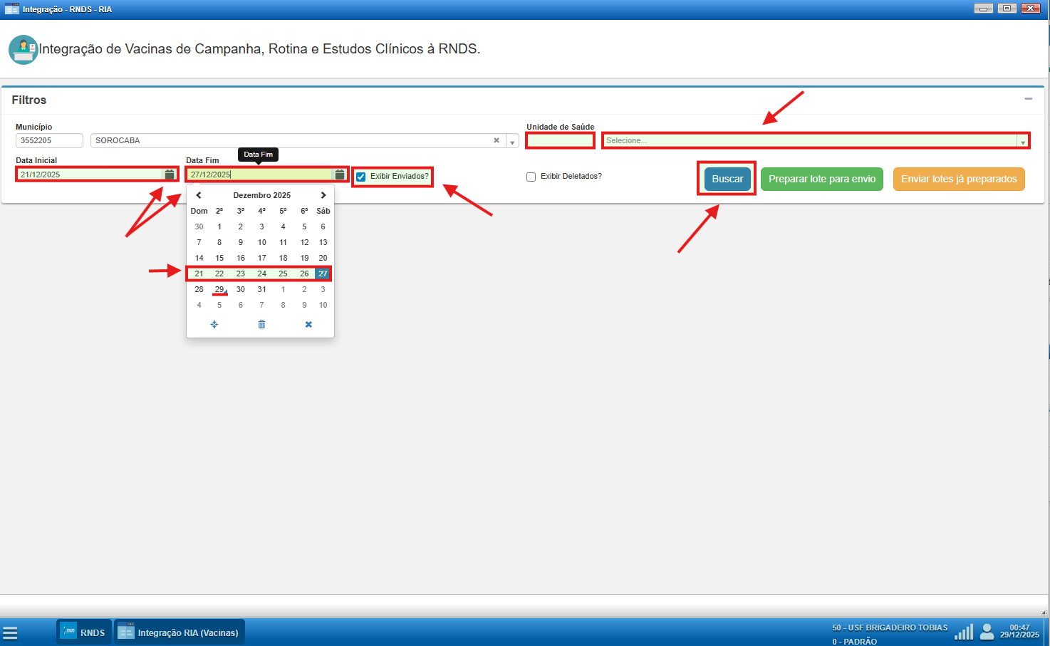 Ao acessar a tela de Integração RIA (Vacinas), limpe o campo de unidade de saúde, garantindo que os dados sejam consultados de forma consolidada. Em seguida, selecione o período correspondente à semana anterior, preferencialmente utilizando o calendário do sistema para marcar o primeiro dia da semana (domingo) até o último dia (sábado).