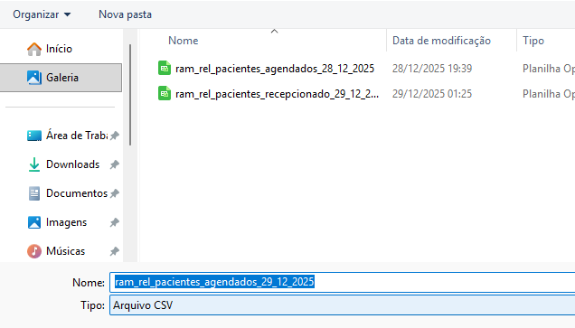 O sistema, por padrão, salva o arquivo com o nome ram_rel_pacientes_agendados_[data_atual]. Recomenda-se renomear os arquivos antes do upload, substituindo o termo agendados por recepcionado ou faltou, conforme o conteúdo de cada arquivo, a fim de evitar confusão durante o processo de envio ao upFiles.