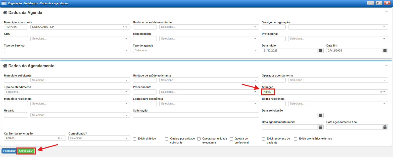 Após a conclusão do primeiro download, reaproveite os demais campos já preenchidos, alterando apenas o campo Situação, selecionando a opção Faltou, e clique novamente em Gerar CSV para obter o segundo arquivo necessário à composição da análise de absenteísmo.
