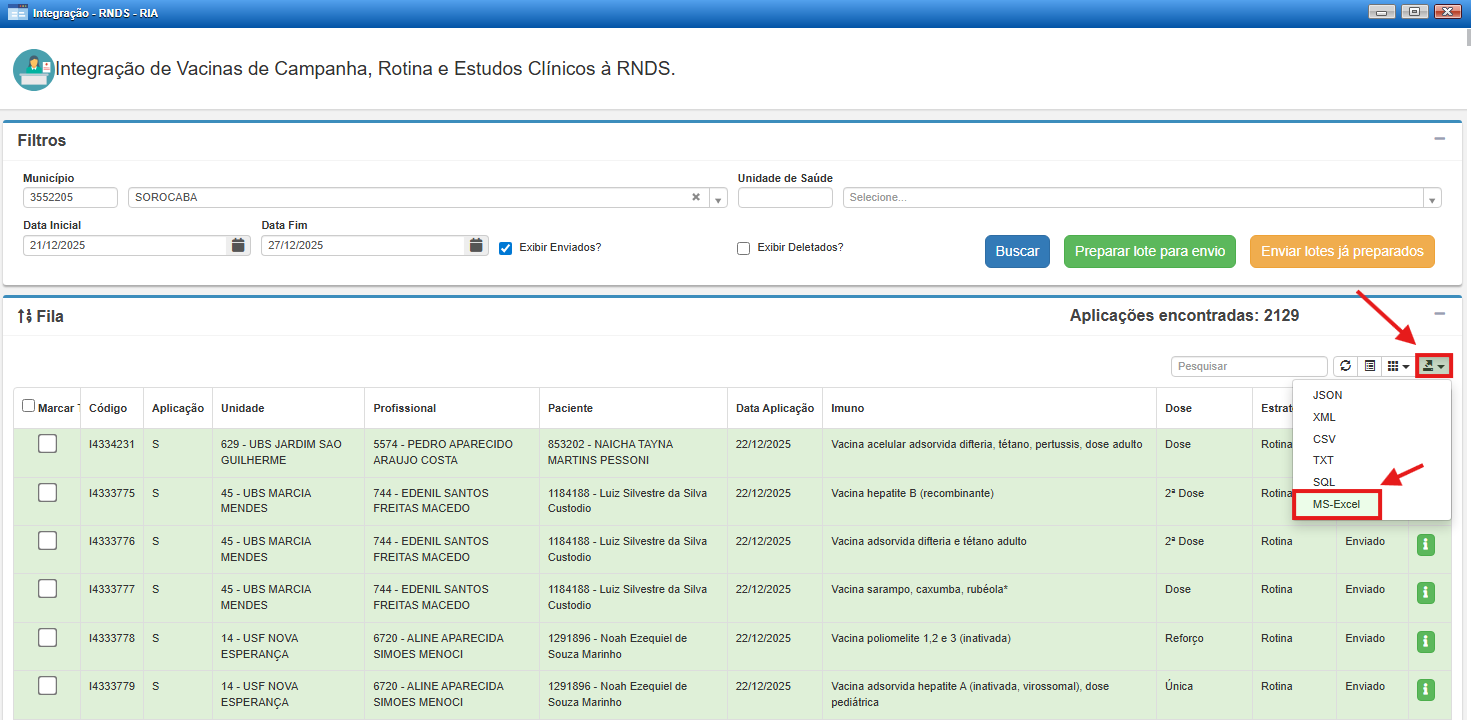 Assim que os dados forem exibidos no sistema, clique no botão de exportação de dados e selecione a opção MS Excel para realizar o download do arquivo.