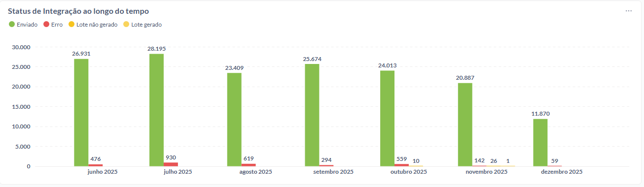 O gráfico de Status de Integração deve concentrar os registros nos status Enviado e Erro. A presença de status como Lote não gerado ou Lote gerado indica inconsistências no processo de preparação ou envio dos dados e deve ser tratada no sistema de origem antes de novas atualizações. |