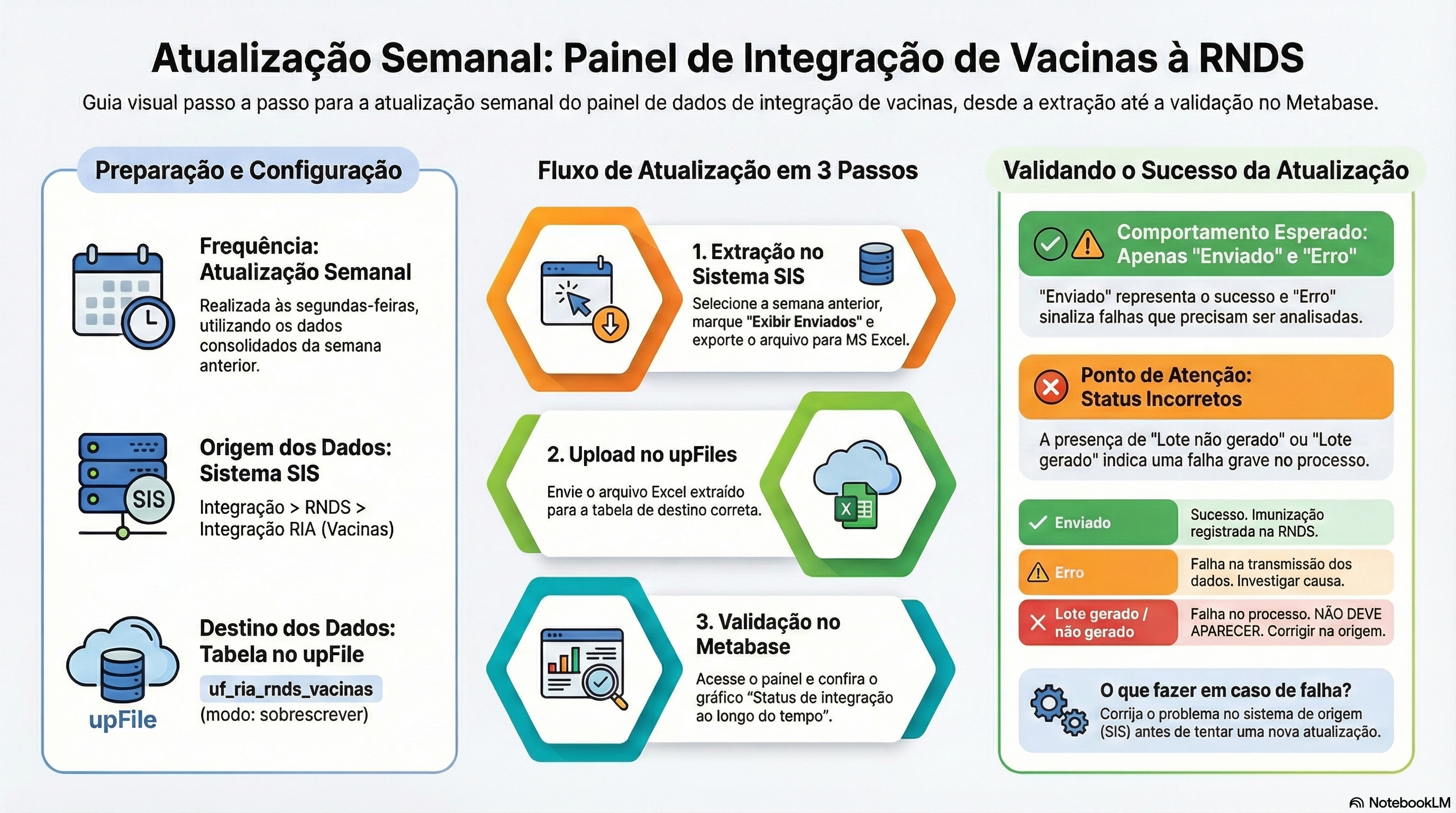 | Período que deve ser atualizado | Semanal, com upload realizado uma vez por semana, considerando sempre os dados da semana anterior. A atualização deve ocorrer às segundas-feiras, após a finalização da transmissão e correção das vacinas registradas na sexta-feira e no sábado. |