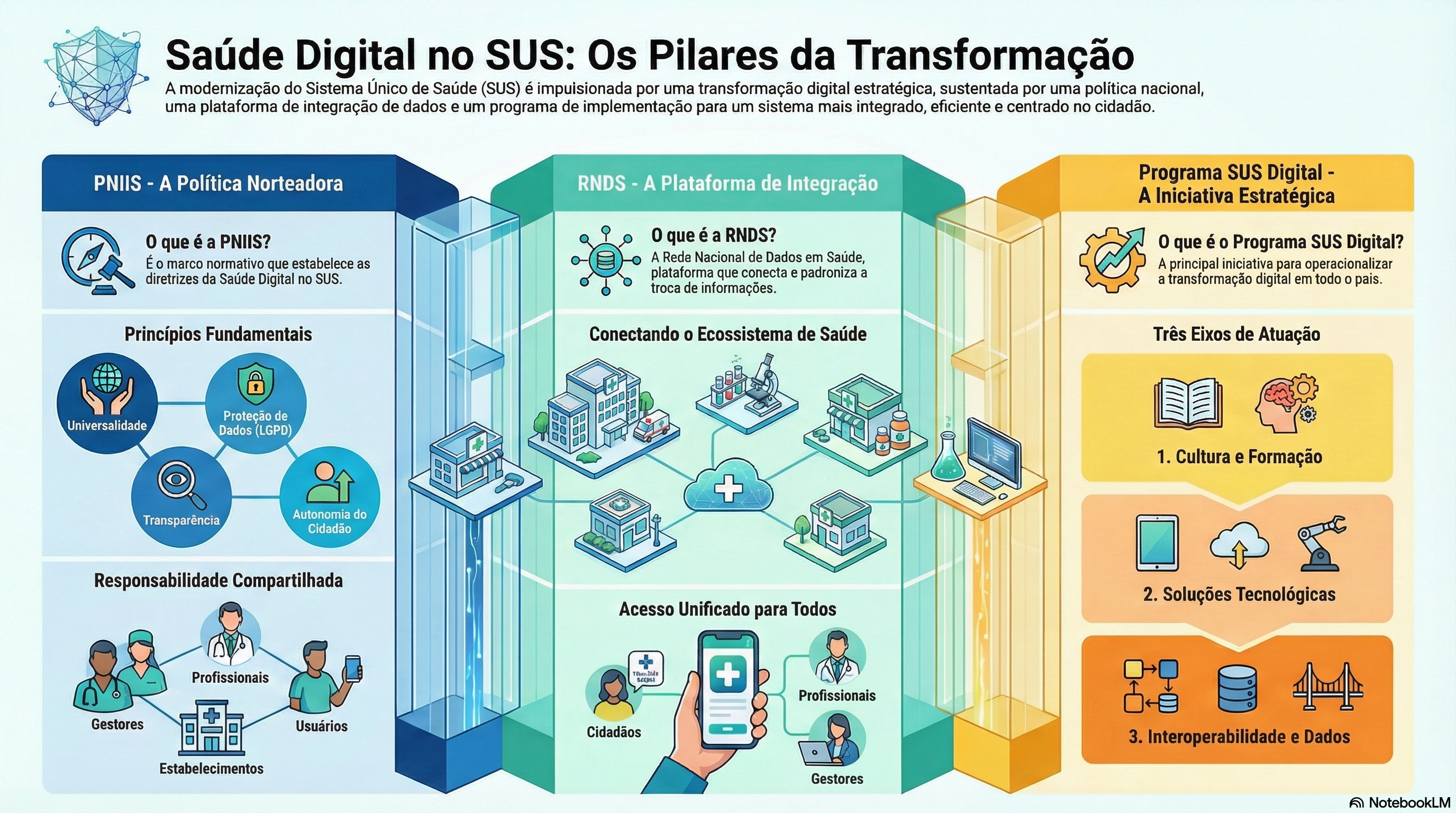 A PNIIS é uma política norteadora da Saúde Digital e é considerada o marco normativo mais amplo para a transformação digital no SUS. Ela serve como base legal e operacional para a implantação de soluções digitais seguras, éticas e interoperáveis. Essa regulamentação orienta a integração, a modernização e o uso estratégico da informação em todo o SUS e tem os seguintes princípios: