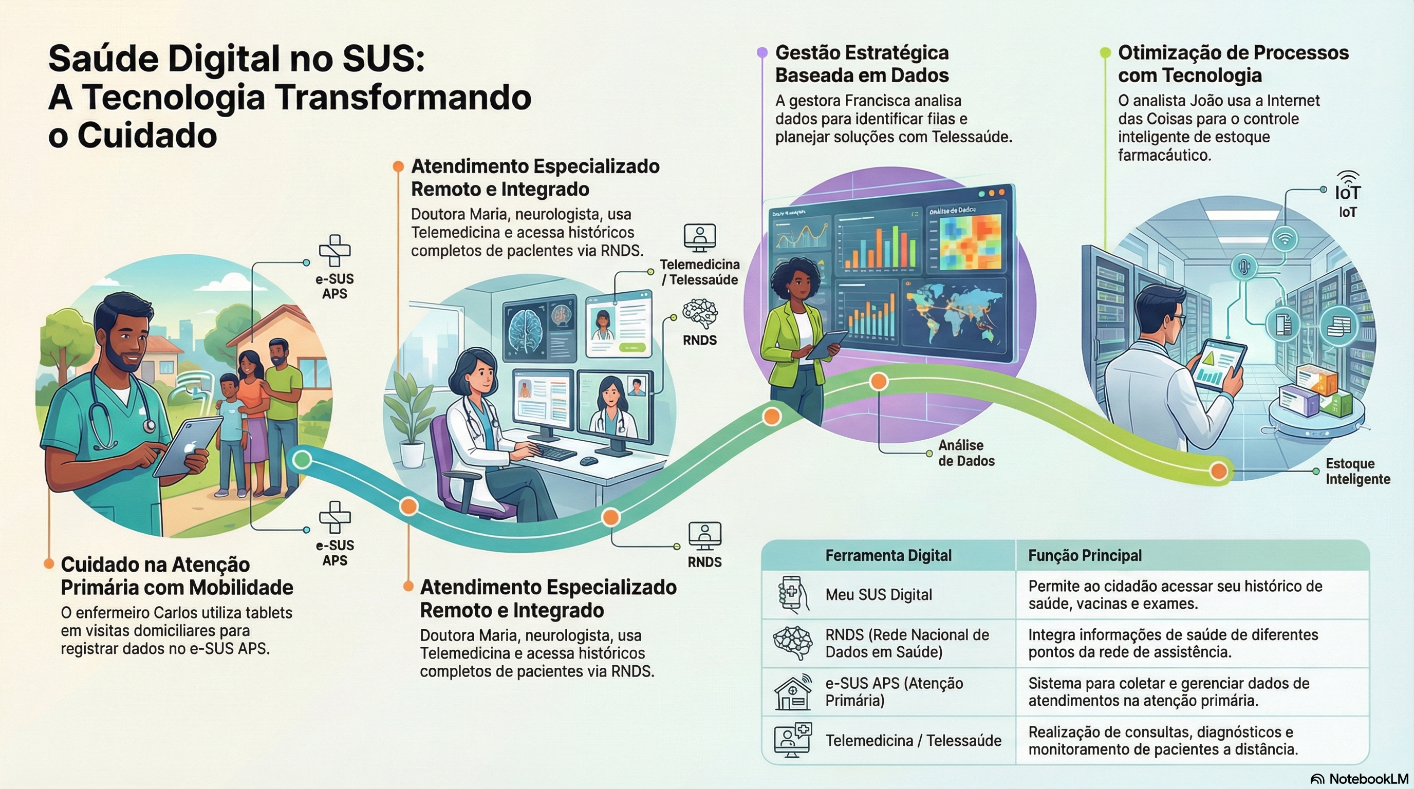 Neste material, vamos explorar diversas formas de aplicação da Saúde Digital por meio da apresentação de quatro situações fictícias inspiradas na realidade profissional do Sistema Único de Saúde (SUS). Essas situações são as histórias da médica Maria, do enfermeiro Carlos, da gestora Francisca e do analista João. As narrativas demonstram o uso das ferramentas: Telemedicina; Prontuário Eletrônico do Cidadão (PEC); Rede Nacional de Dados em Saúde (RNDS); Meu SUS Digital (antigo Programa Conecte SUS); Estratégia e-SUS Atenção Primária à Saúde (e-SUS APS); Inteligência Artificial (IA) para análise de exames; e painéis interativos para visualização de indicadores.