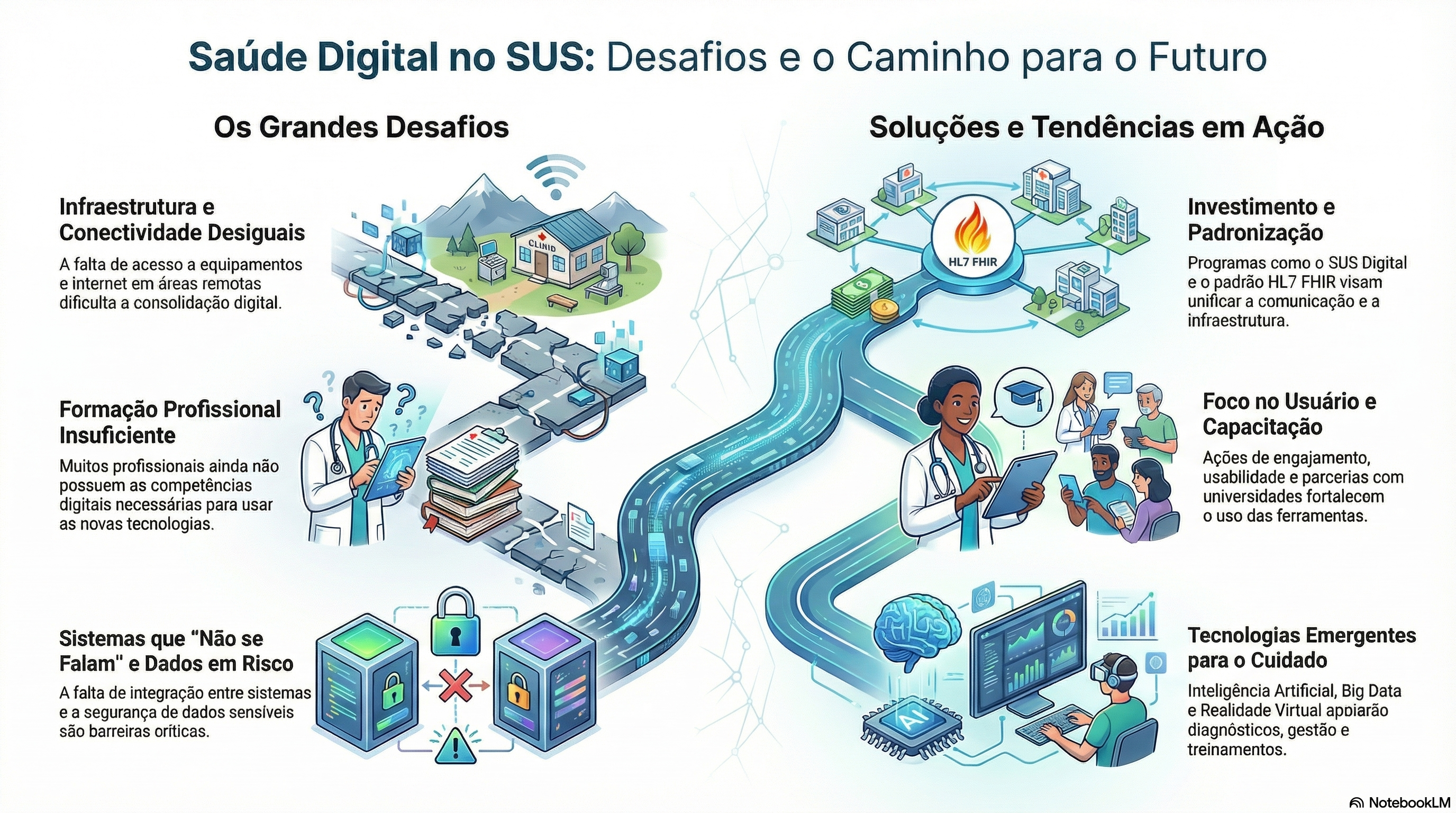 A superação das barreiras de infraestrutura, a qualificação dos profissionais, a garantia da interoperabilidade e a segurança dos dados são os pilares estruturais para a implementação da Saúde Digital no SUS.
